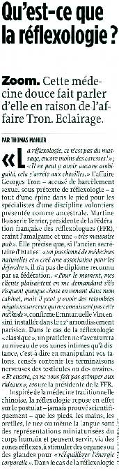 (…..) « La réflexologie, ce n’est pas du massage, encore moins des caresses ! » ; « Il ne faut y avoir aucune ambiguïté, cela s’arrête aux chevilles. » L’affaire Georges Tron – accusé de harcèlement sexuel sous prétexte de réflexologie – a tout d’une épine dans le pied pour les spécialistes d’une discipline volontiers présentée comme ancestrale. Martine Boisserie Terrier, présidente de la Fédération Française des Réflexologues (FFR), craint l’amalgame et une « très mauvaise pub ». Elle précise que, si l’ancien secrétaire d’Etat est « un passionné de médecines naturelles et a créé une association pour les défendre », il n’a pas de diplôme reconnu par sa fédération. « Pour le moment, mes clients plaisantent en me demandant s’ils risquent quelque chose en venant dans mon cabinet, mais il peut y avoir des retombées négatives sur ceux qui ne connaissent pas cette méthode », confirme Emmanuelle Vincensini, installée dans le 12è arrondissement parisien. Dans le cas de la réflexologie « classique », un praticien ne s’aventurera au niveau de vos zones intimes qu’à distance, c’est- à -dire en manipulant vos talons, censés contenir les terminaisons nerveuses des testicules ou des ovaires. « Et encore, ça ne vous fait pas grimper aux rideaux », assure la présidente de la FFR. Inspirée de la médecine traditionnelle chinoise, la réflexologie repose en effet sur le postulat- jamais prouvé scientifiquement – que les pieds, les mains, les oreilles, le nez ou même la langue sont des représentations miniaturisées du corps humain et peuvent servir, via des zones réflexes, à stimuler des organes ou des glandes pour « rééquilibrer l’énergie corporelle ». Dans le cas de la réflexologie plantaire – de très loin la forme la plus répandue – « tout part du principe que le corps est cartographié dans le pied, explique Emmanuelle Vincensini. On va ainsi travailler les zones de projection en fonction des pathologies du patient. L’orteil représente la tête, les métatarses, le buste, le bord interne de chaque pied, la colonne vertébrale ». Bien appliquée, la réflexologie permettrait, selon ces professionnels, de « soulager » divers troubles, comme le stress, les migraines, les problèmes de constipation ou de respiration, et de manière préventive de « libérer les capacités d’auto guérison du corps ». Mais cette discipline cousine de l’acupuncture et du shiatsu, implantée en France depuis une trentaine d’années, ne bénéficie d’aucune reconnaissance légale, même si elle a désormais droit d’entrée dans certains hôpitaux en tant que soin complémentaire. « Nous sommes en retard par rapport à la Grande-Bretagne ou les pays scandinaves », assure Martine Boisserie Terrier, qui milite pour démontrer que la réflexologie apporte « plus qu’un simple bien-être ». Le bouche- à - oreille pour ces « thérapeutiques » plantaires semble, lui, bien fonctionner. « Les gens se tournent de plus en plus vers les médecines douces. Ils en ont ras le bol de prendre des médicaments pour tout et n’importe quoi, phénomène encore accentué par les scandales pharmaceutiques », affirme Emmanuelle Vincensini.